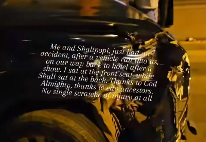 “Me and Shalipopi, just had an accident, after a vehicle ran into us, on our way back to hotel after a show,” he wrote.